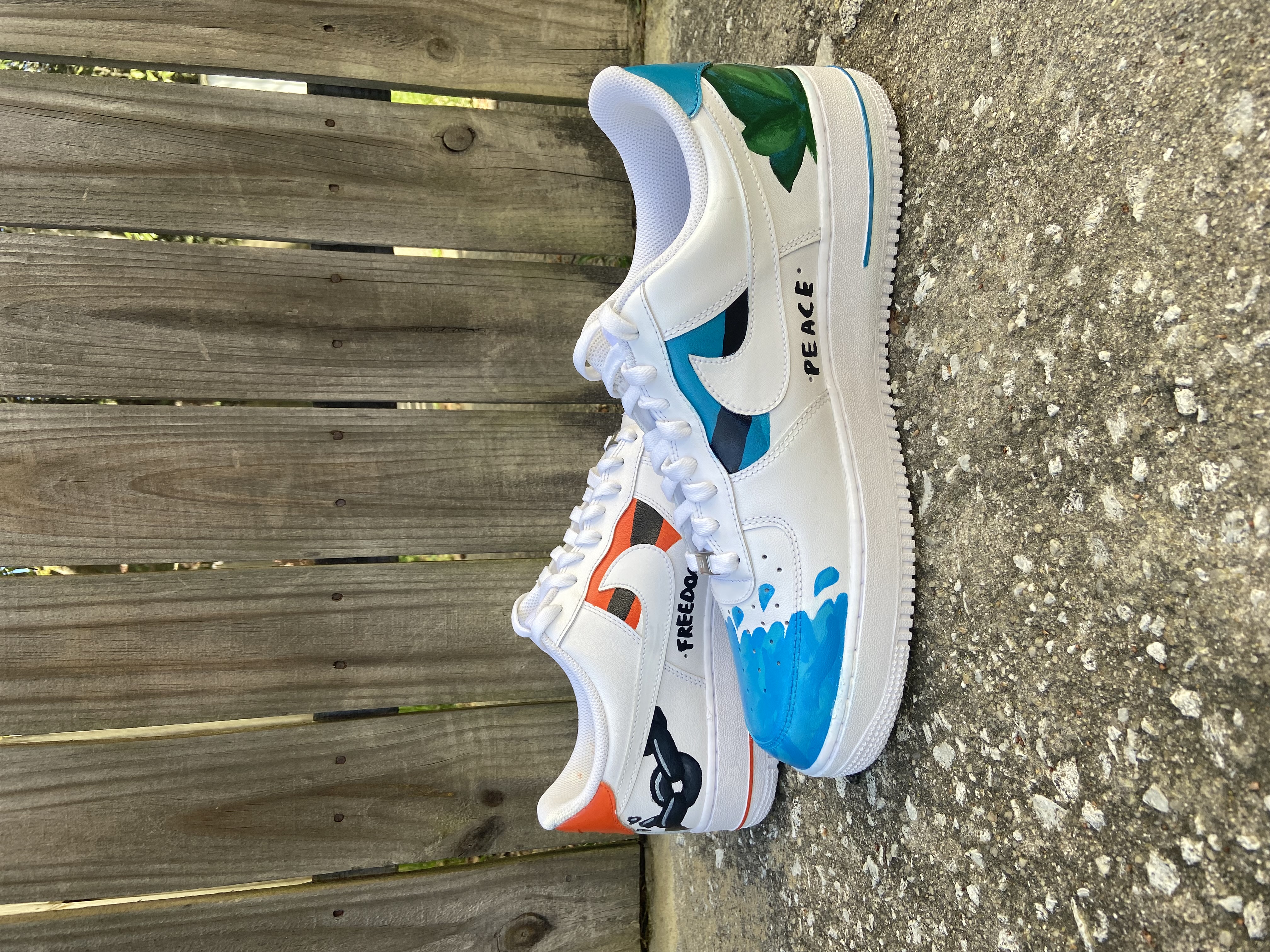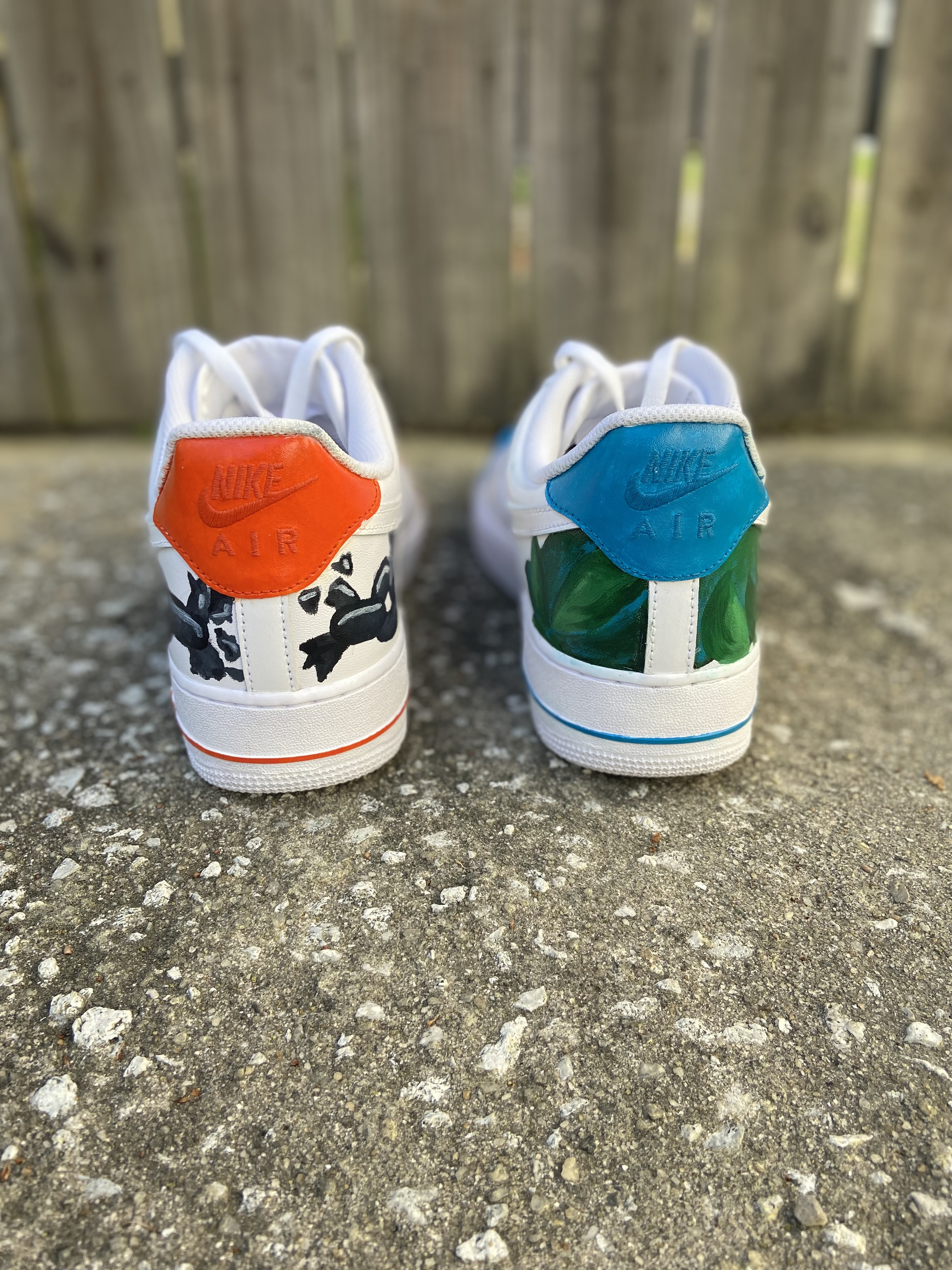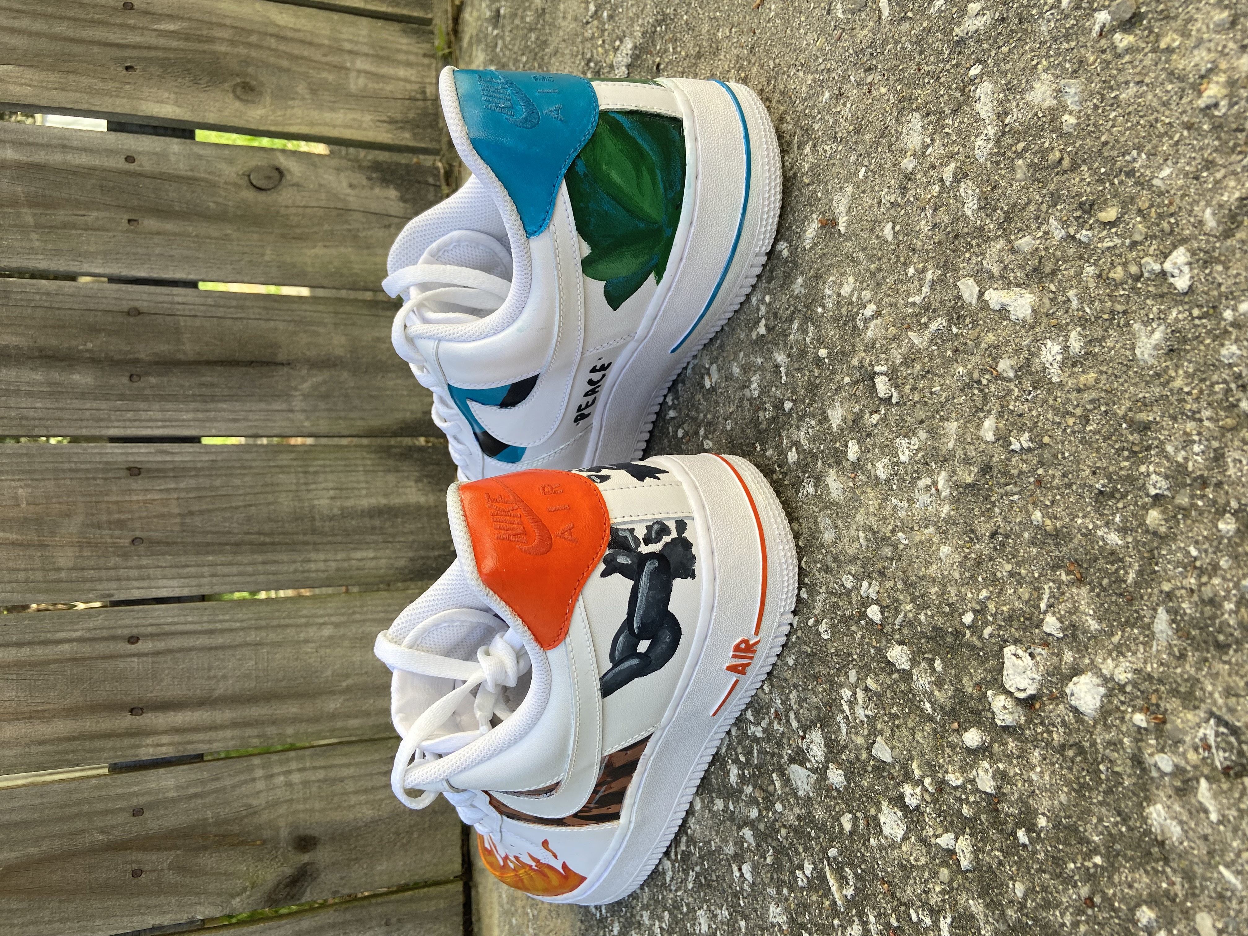 This was the first pair of Nikes I ever painted. Before DrippyKix began, I was painting custom shoes just for fun for friends. The business idea sparked one Sunday morning at church when a youth leader offered me $50 to paint whatever I wanted on a brand-new pair of Air Force 1s. And that’s how these were created.