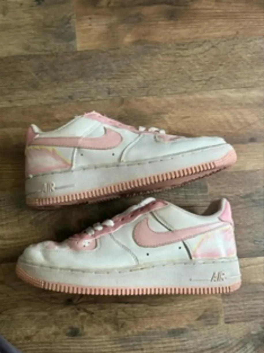 These custom pink Nikes feature a dreamy design with clouds on the front and pink wings on the side, creating a light and airy look. The soft colors and whimsical elements give the shoes a playful vibe.